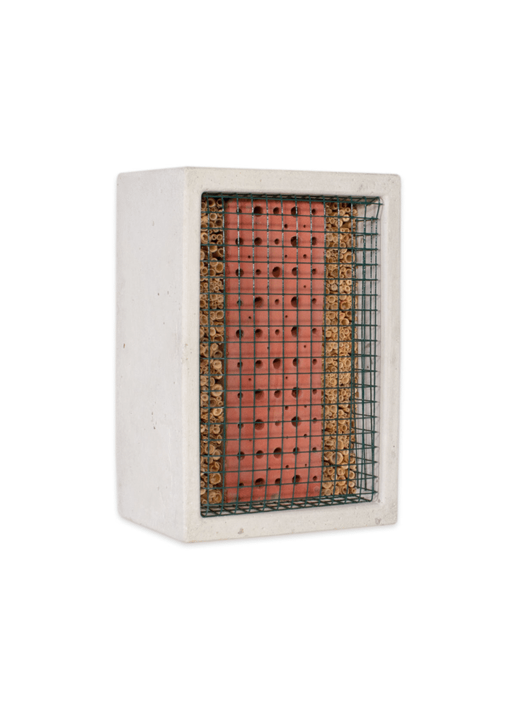 Ruche pour insectes solitaires. Des chambres d'incubation en terre glaise et en roseau sont intégrées dans un bâti en béton de bois SCHWEGLER accumulateur de chaleur. La construction solide minimise les variations de température et est extrêmement thermoactive. Grâce aux différents diamètres et matériaux des chambres d'incubation, cette ruche est très bien acceptée. A encastrer dans un endroit particulièrement bien ensoleillé.