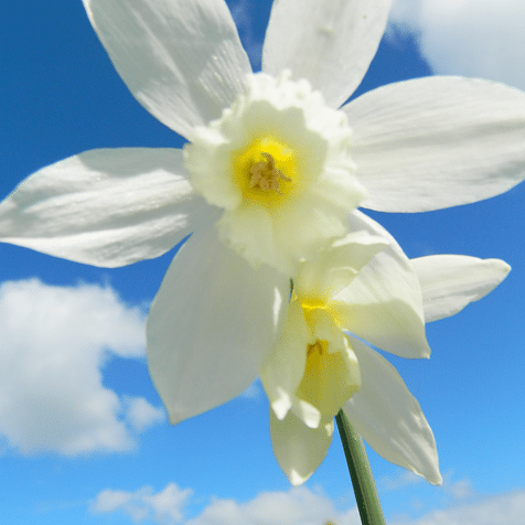 De zuiver witte bloemen waarvan de naar achter gebogen kelkblaadjes een ster vormen. De eveneens zuiver witte, gegolfde cup, heeft de vorm van een drinkbeker. Meerdere bloemen per steel.