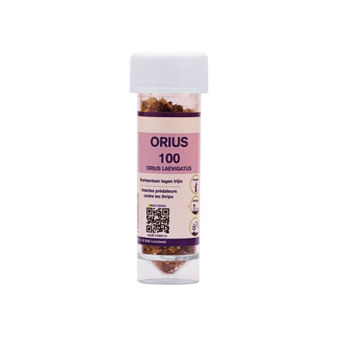 Éparpiller Orius dans et autour des foyers de thrips, avec un minimum de 5 à 10 insectes prédateurs par m², selon l'infestation. Orius est disponible par 100 ou 500 unités.