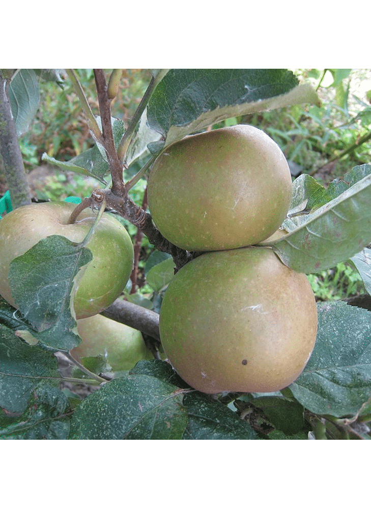 Vrucht: middelmatig, rond en gelijkmatig gevormd, geel- tot roestbruin met ruwe schil en aan zonzijde bronsrood. Groenachtig wit en vast vruchtvlees
