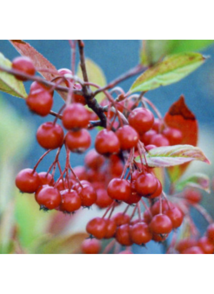 Hij produceert langdurig eetbare rode vruchten, waar vogels dol op zijn.